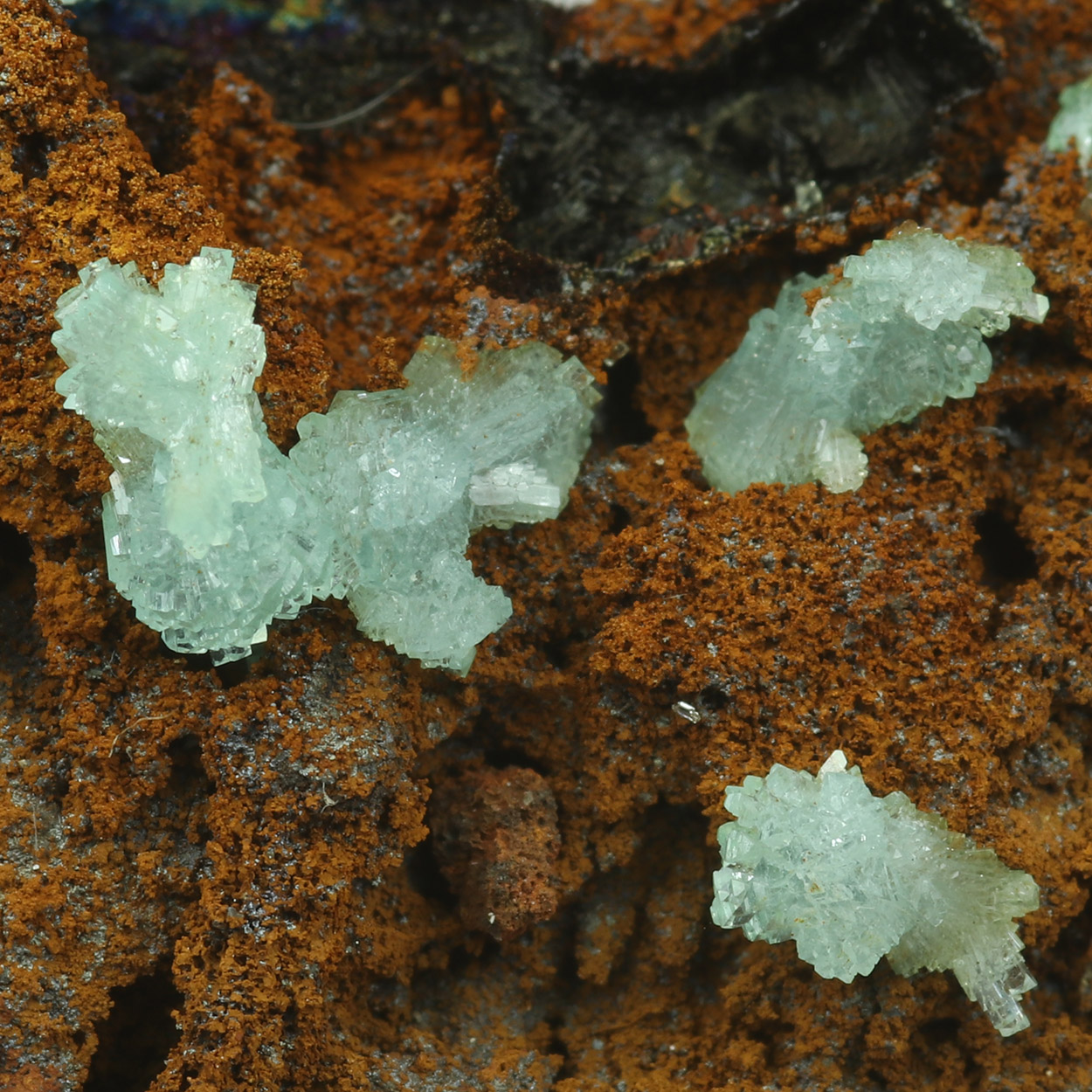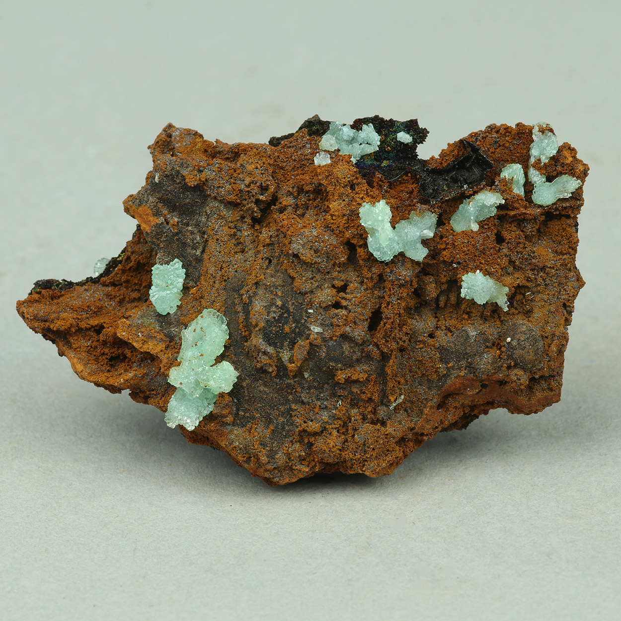 Crystals of gemmy and lustrous, light blue adamite on contrasting limonitic matrix. A good Lavrion adamite from a recent find. Well sized crystals for Greece!