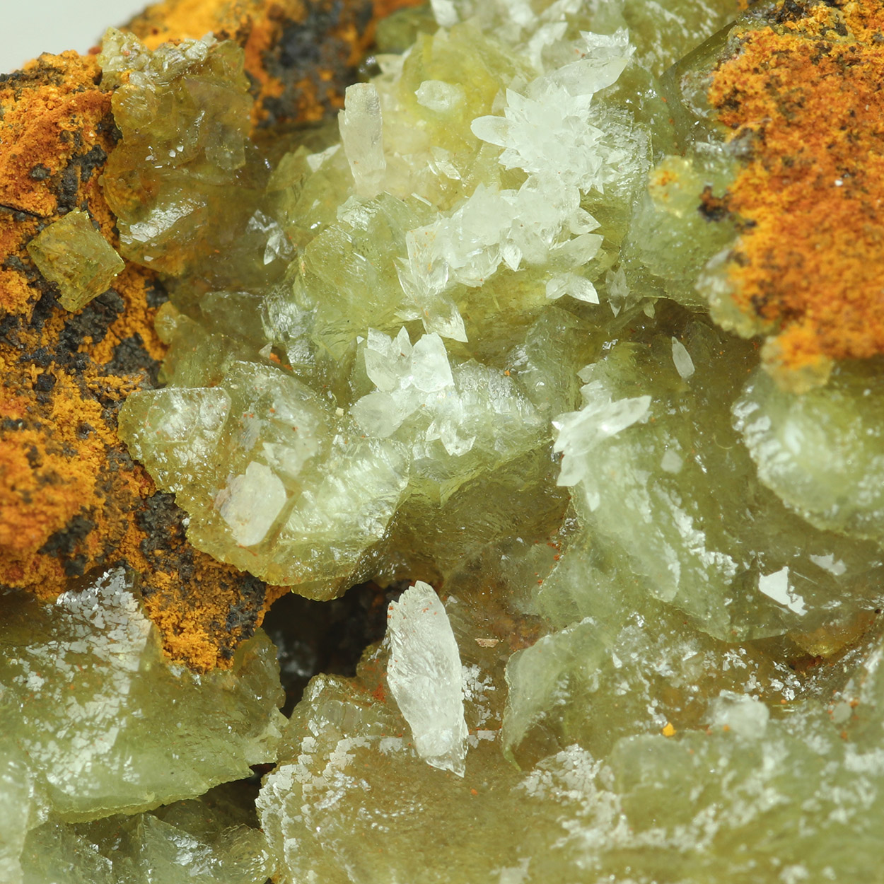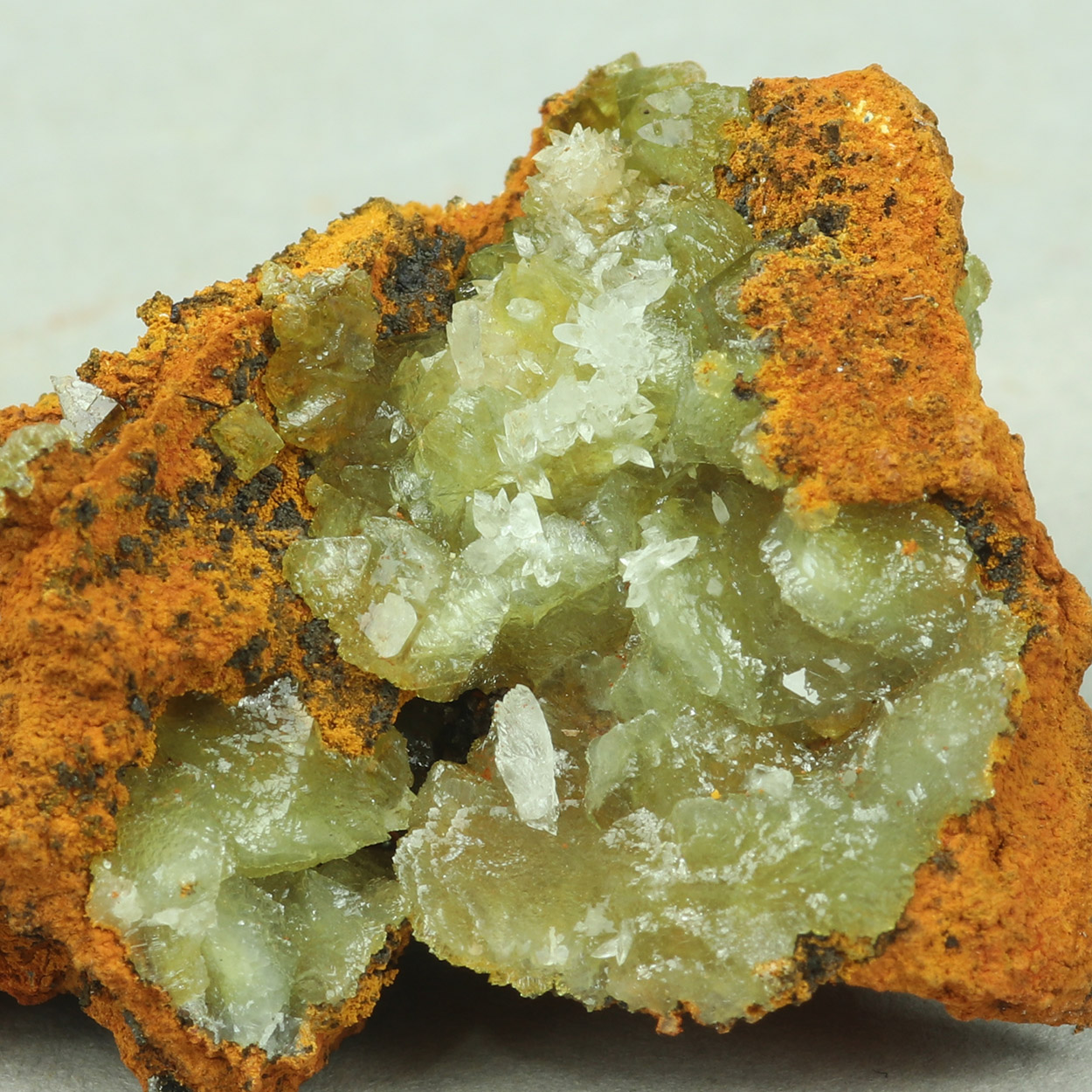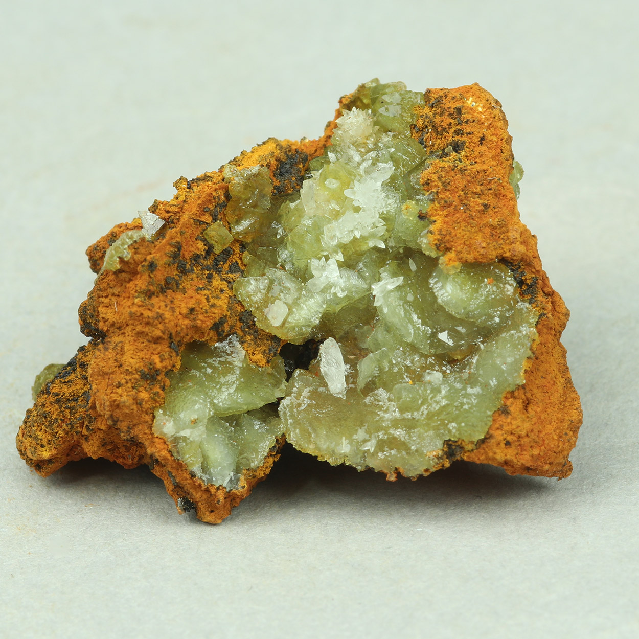Gemmy and lustrous crystals of honey-colored adamite with aragonite on limonitic matrix. A nice example from a recent find.