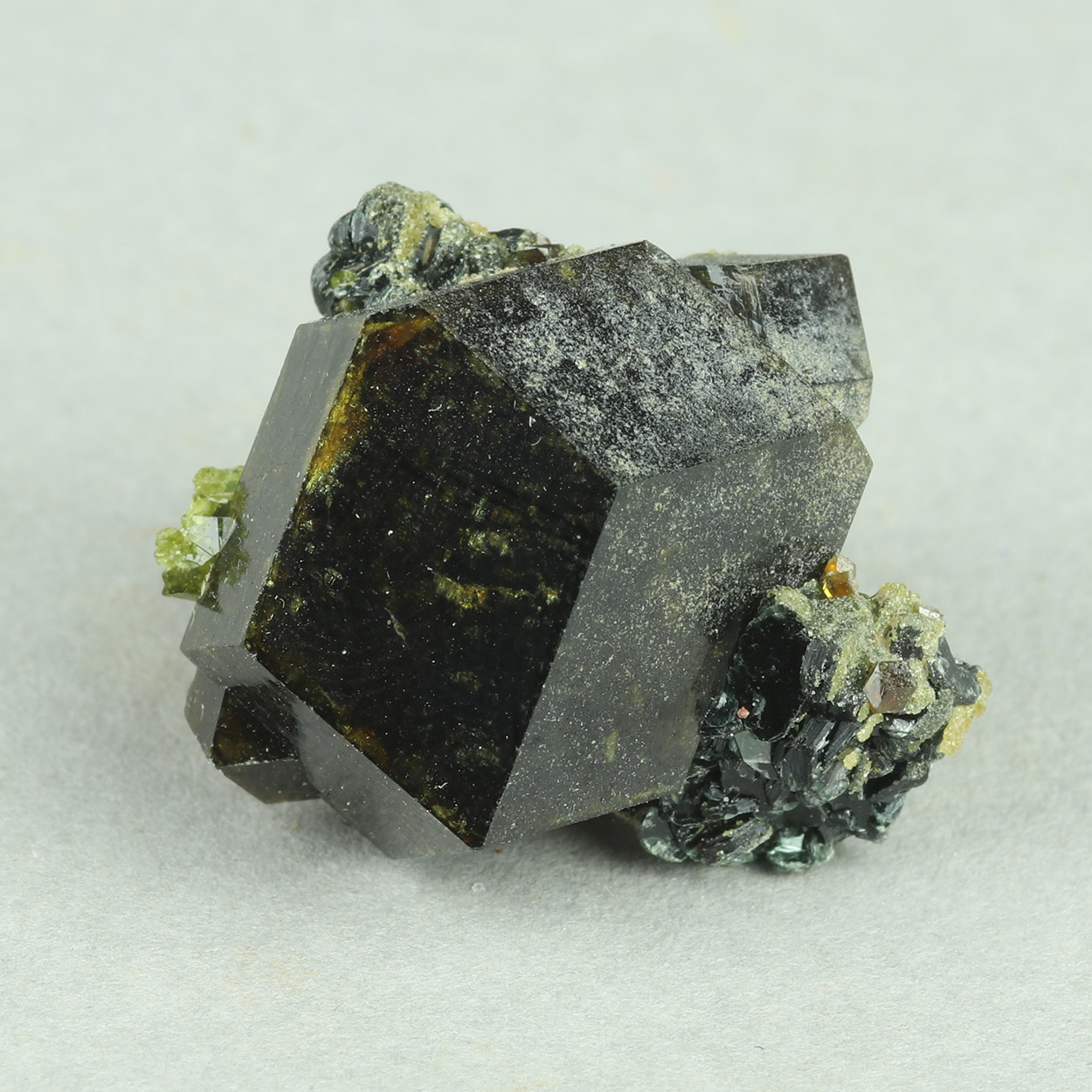 Sharp, dark brown, dodecahedral crystal of andradite, associated with minor epidote and biotite.