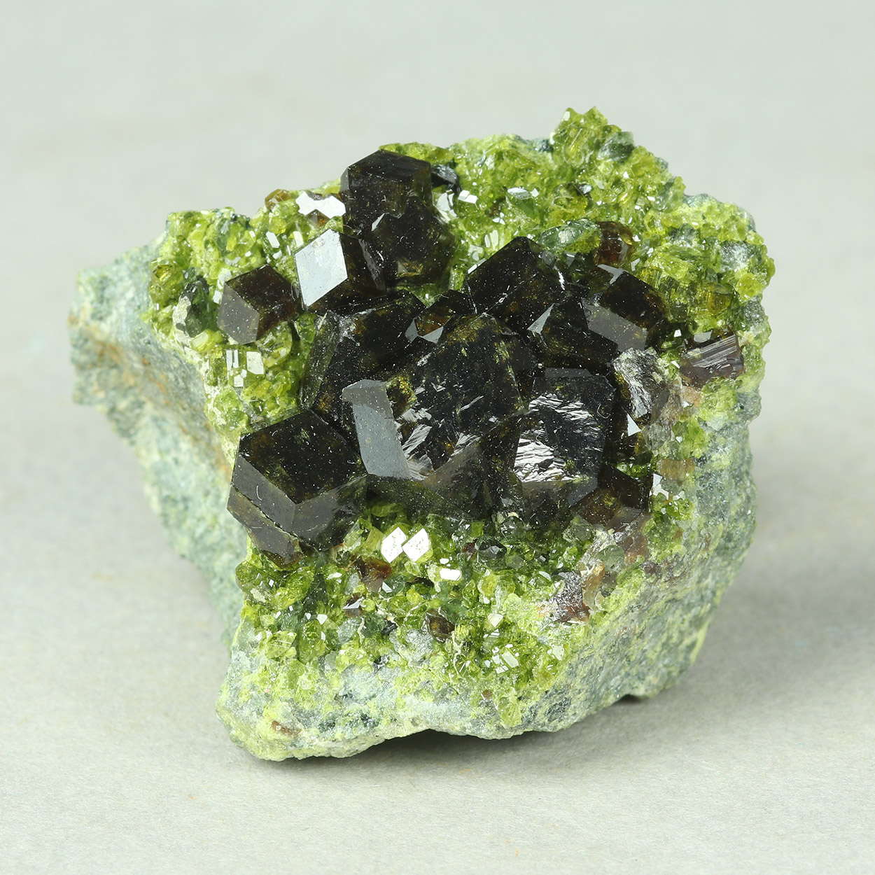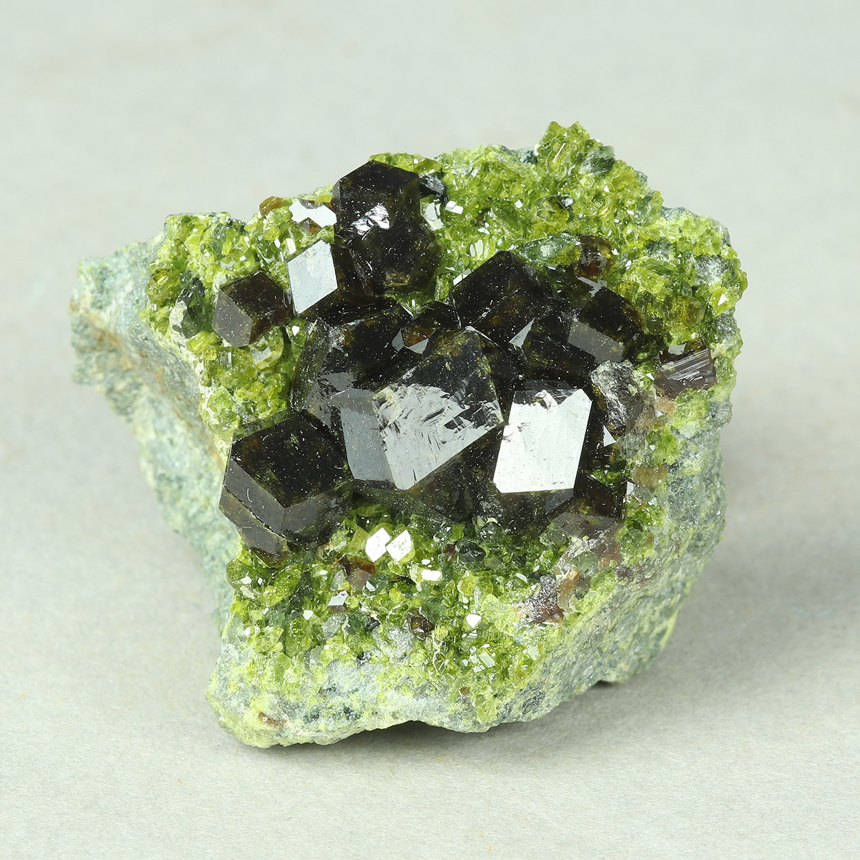 Sharp, highly lustrous, dark brown, dodecahedral crystal of andradite on a matrix, associated with gemmy epidote crystals. Beautiful miniature!