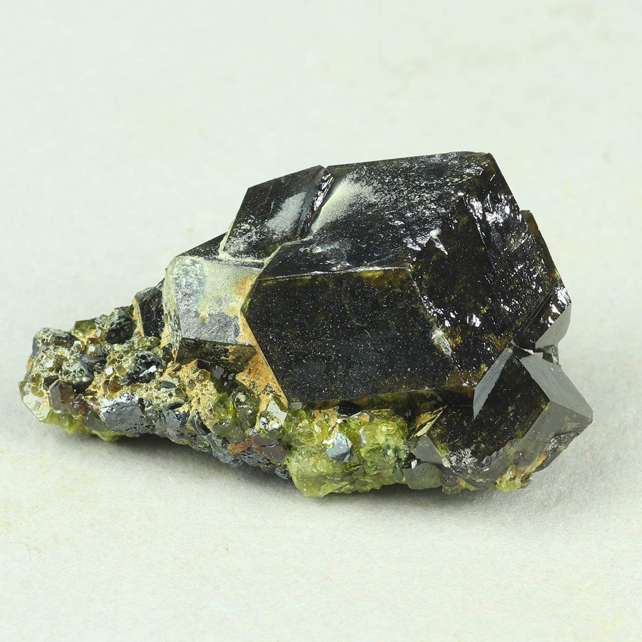Sharp, highly lustrous, dark brown, dodecahedral crystal of andradite on matrix. Beautiful miniature with good crystal size!