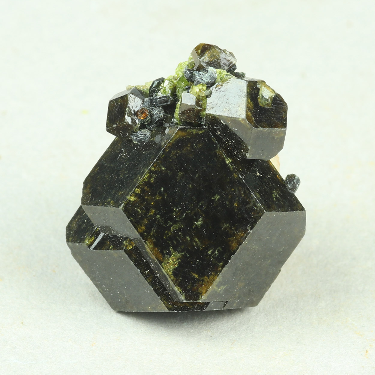 Sharp, highly lustrous, dark brown, dodecahedral crystal of andradite. Beautiful thumbnail specimen with good crystal size!