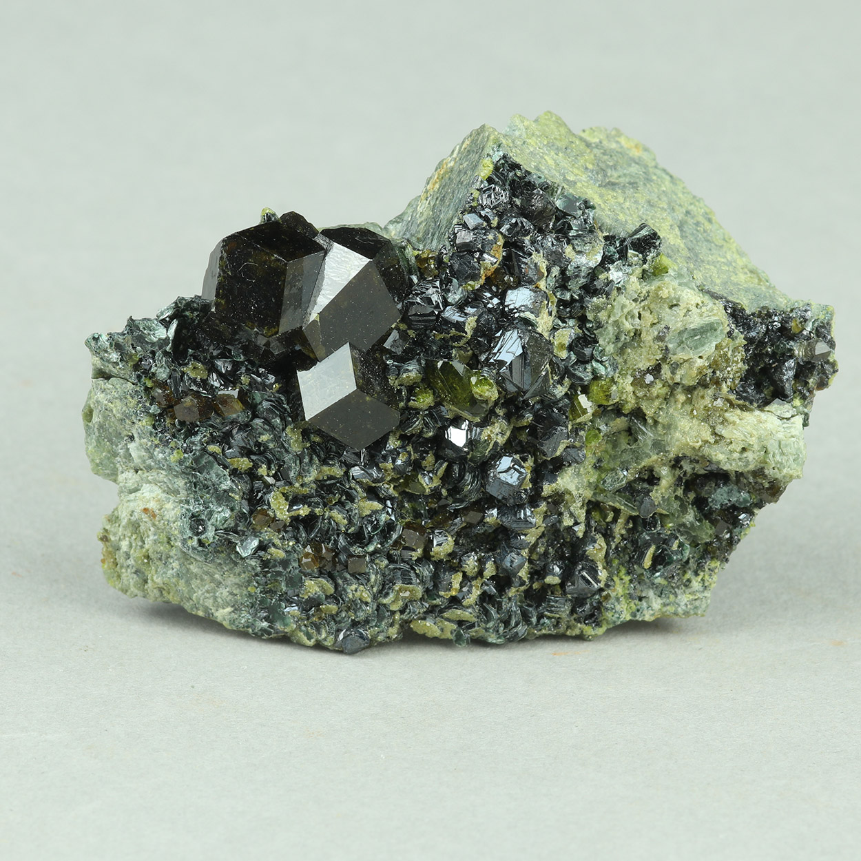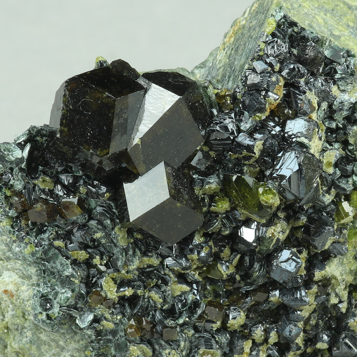 Sharp, highly lustrous, dark brown, dodecahedral crystal of andradite on a matrix, associated with magnetite, gemmy epidote and biotite. Beautiful piece!