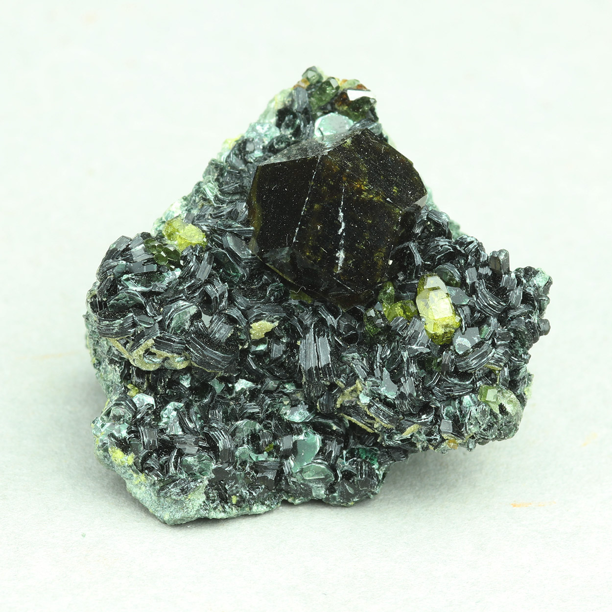 Sharp, highly lustrous, dark brown, dodecahedral crystal of andradite on a matrix, associated with gemmy epidote crystals and biotite. Beautiful piece!
