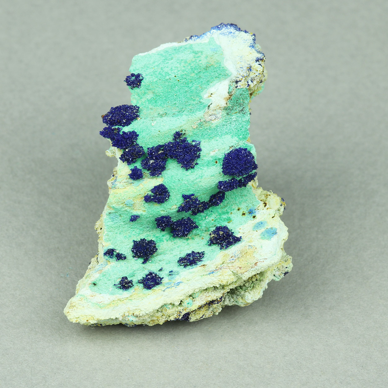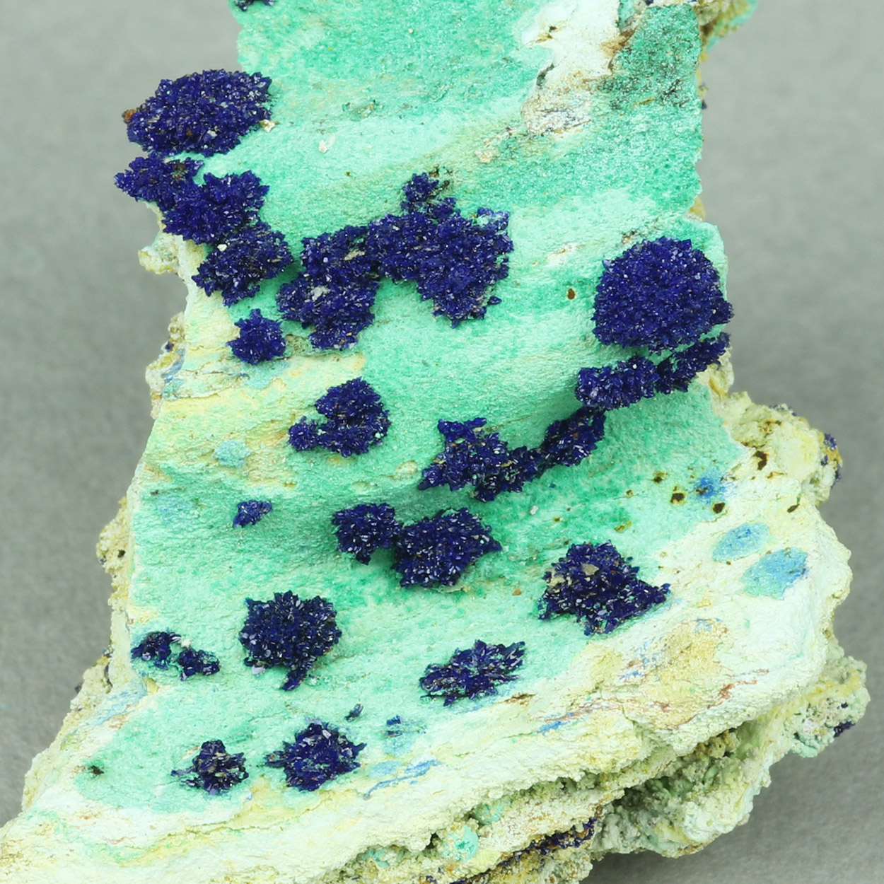 Radial/spherical aggregates of blue, lustrous crystallized azurite on contrasting malachite. Beautiful specimen from a find of May-June, 2025.