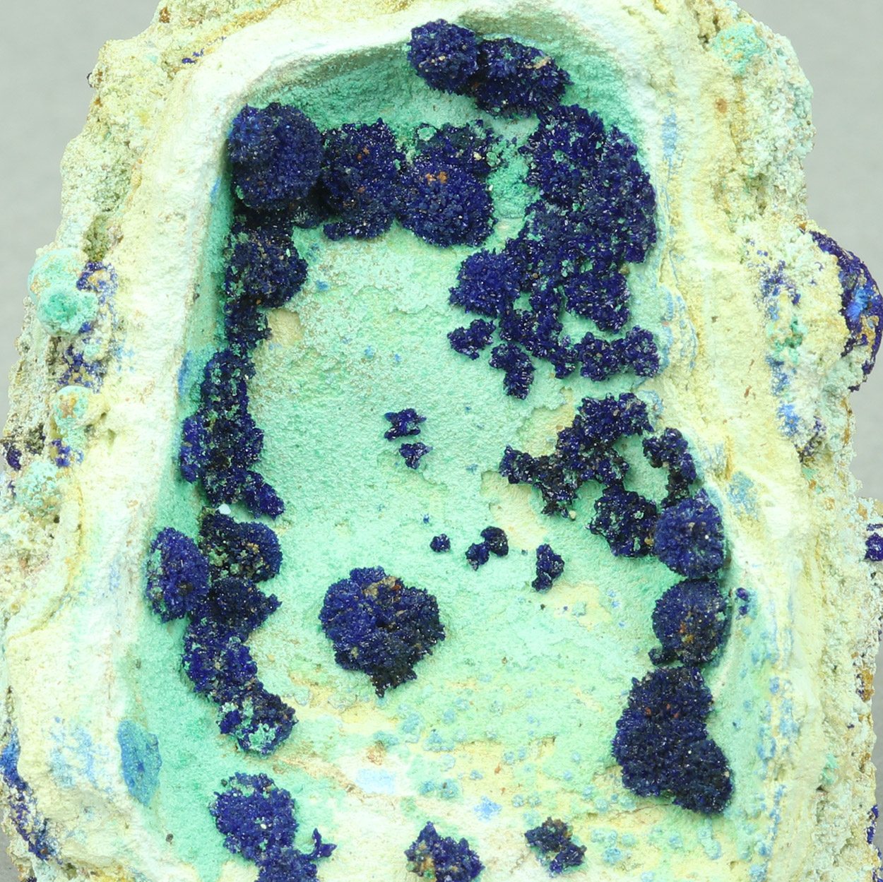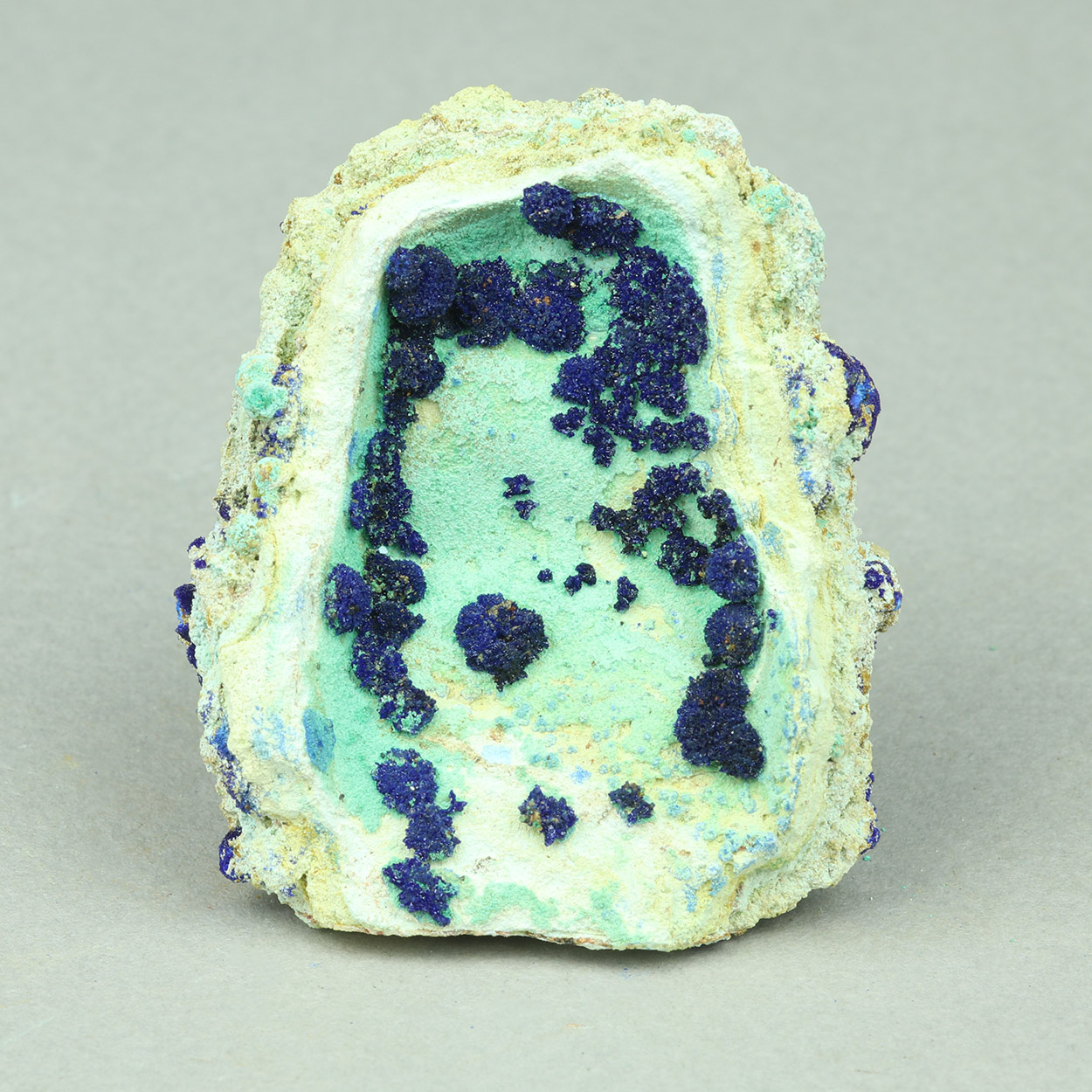 Rich and fine piece with crystallized azurite on contrasting light green malachite. Beautiful specimen from a find of May-June, 2025.