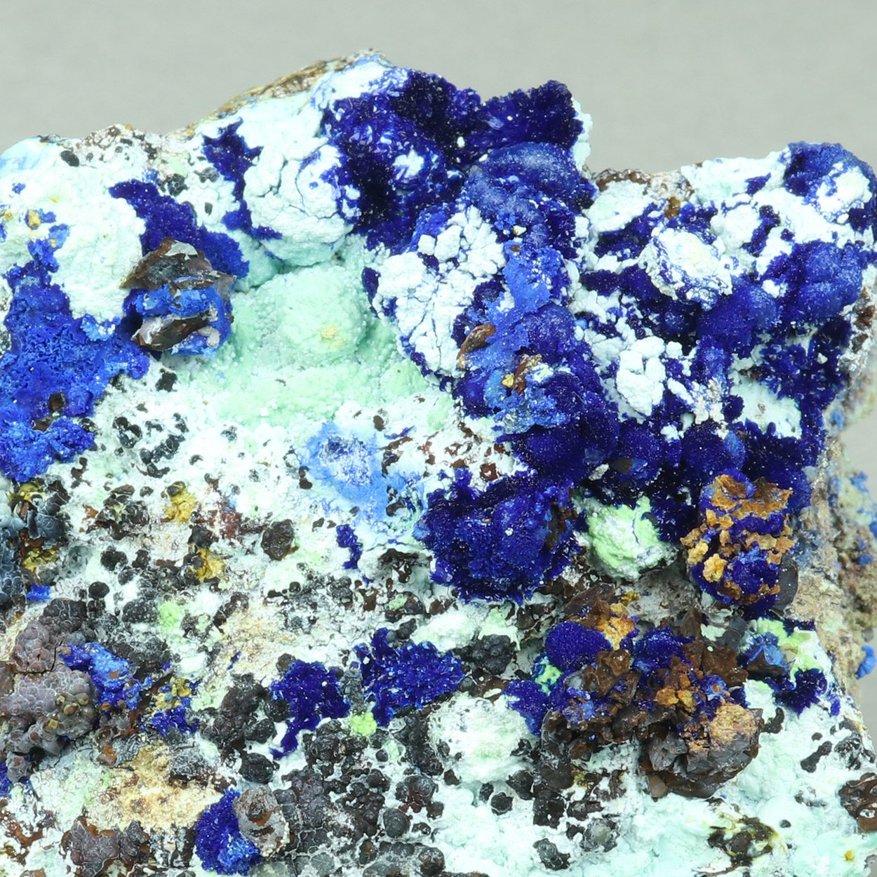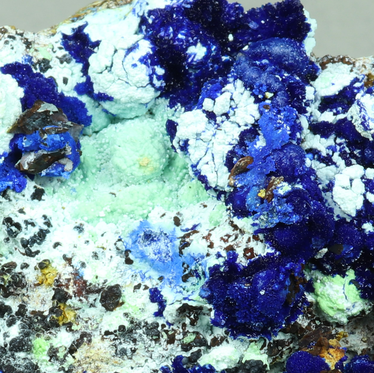 Interesting specimen with blue azurite on contrasting matrix (possibly Gibbsite). As a bonus, there is a ball of azurite that is pseudomorphed after an unknown very light greenish (almost white) mineral. Beautiful piece from a find of May-June, 2025.