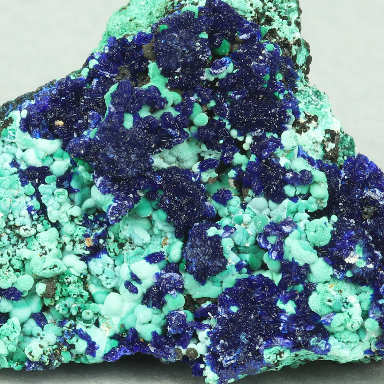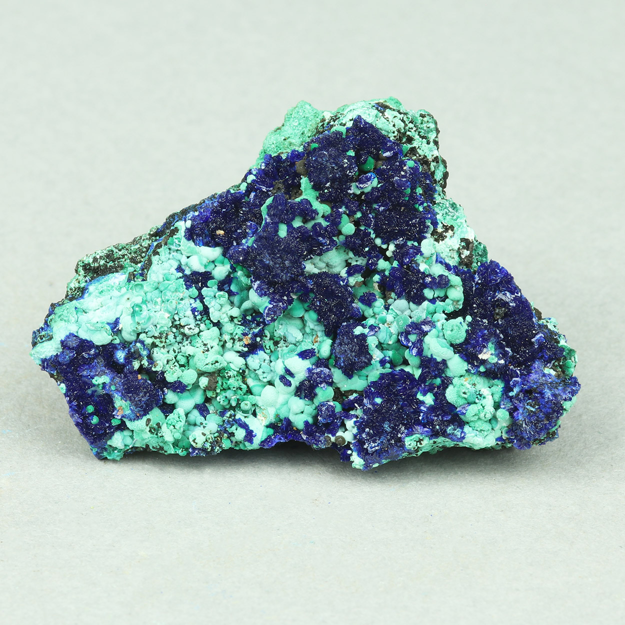 Cute combo piece with blue azurite and contrasting light green malachite. Beautiful specimen from a find of May-June, 2025.