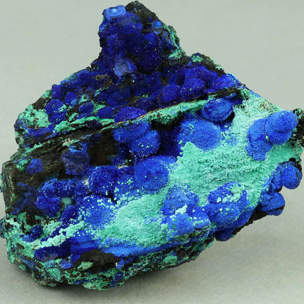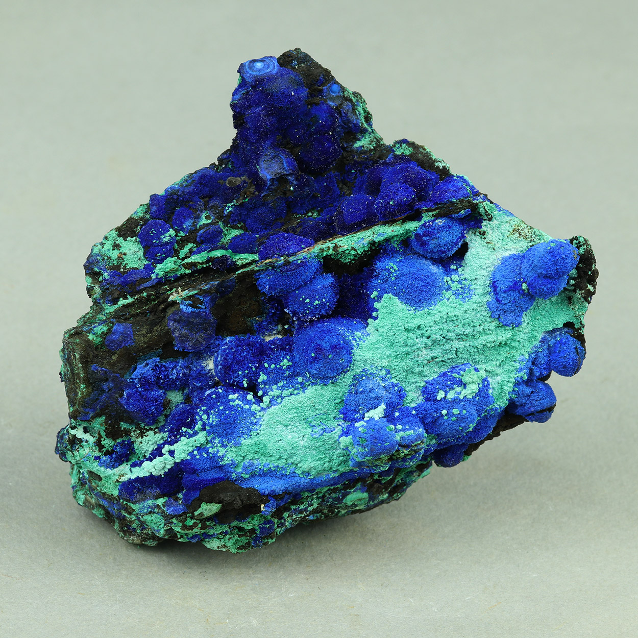 Excellent and well-sized combo specimen with blue azurite balls and contrasting green malachite. Beautiful piece from a find of May-June, 2025.