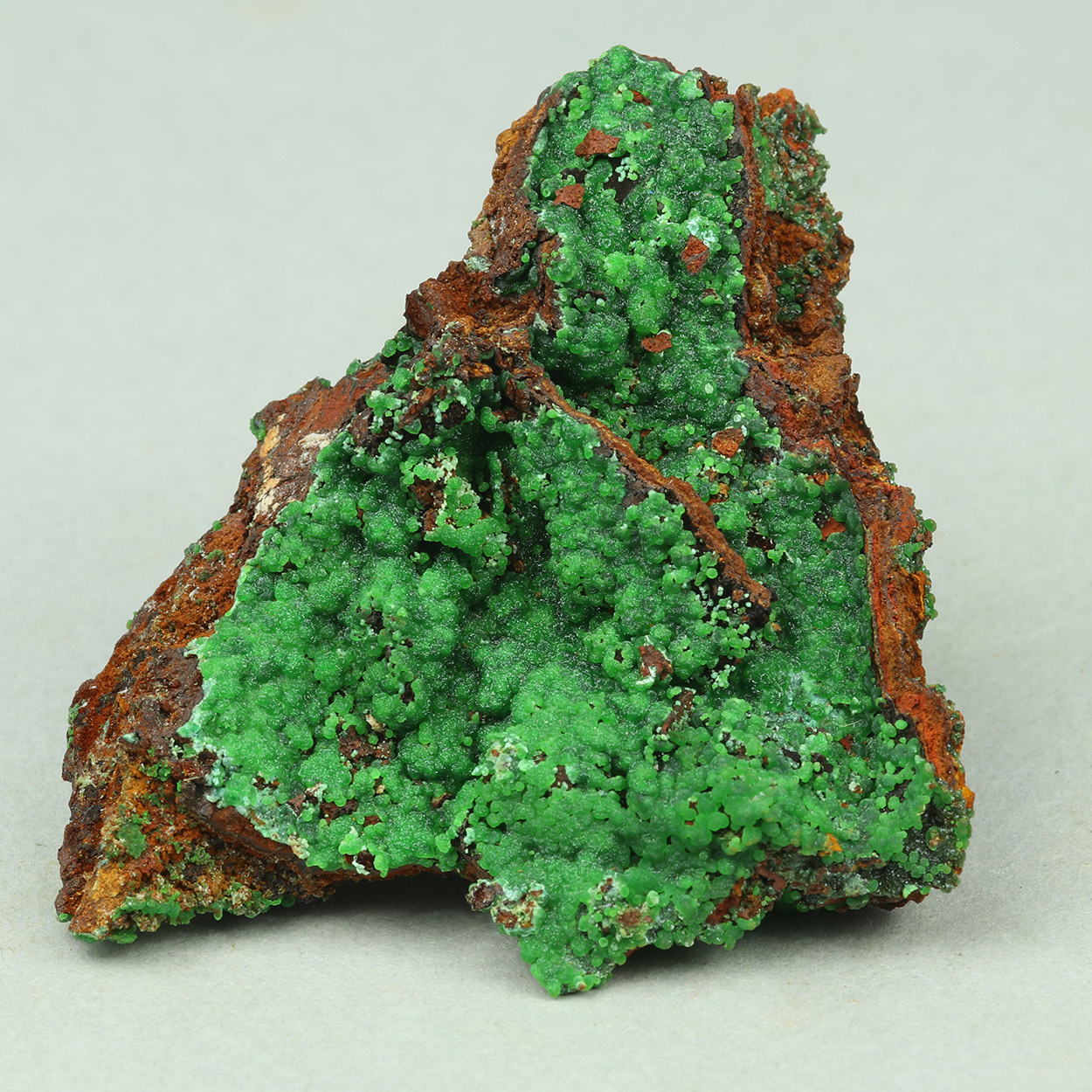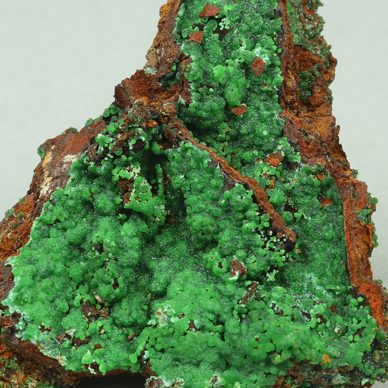 Neon-green spheres of conichalcite on matrix. A fine example of the species from Lavrion.