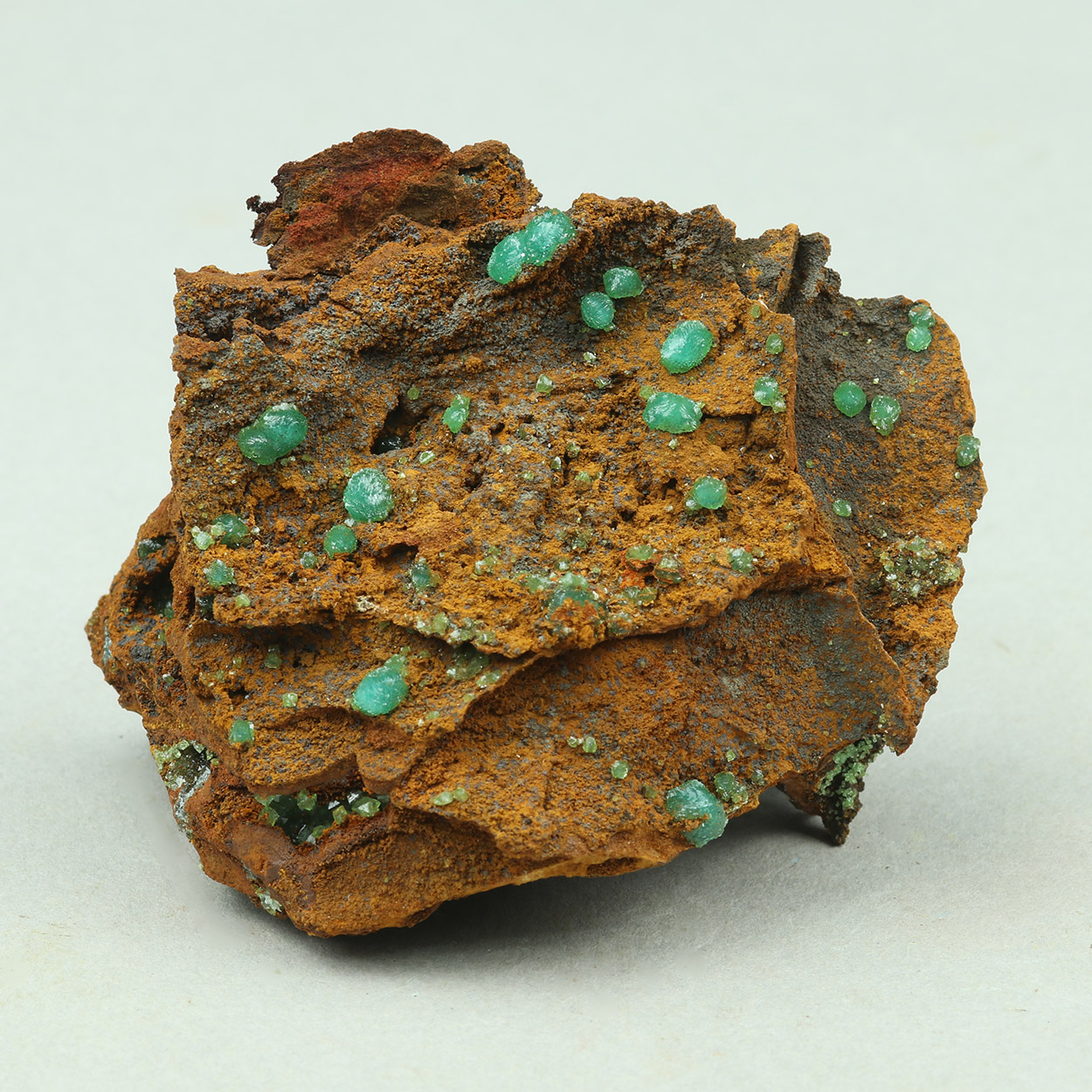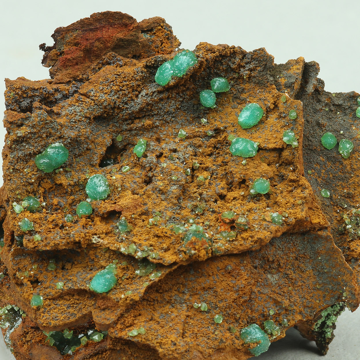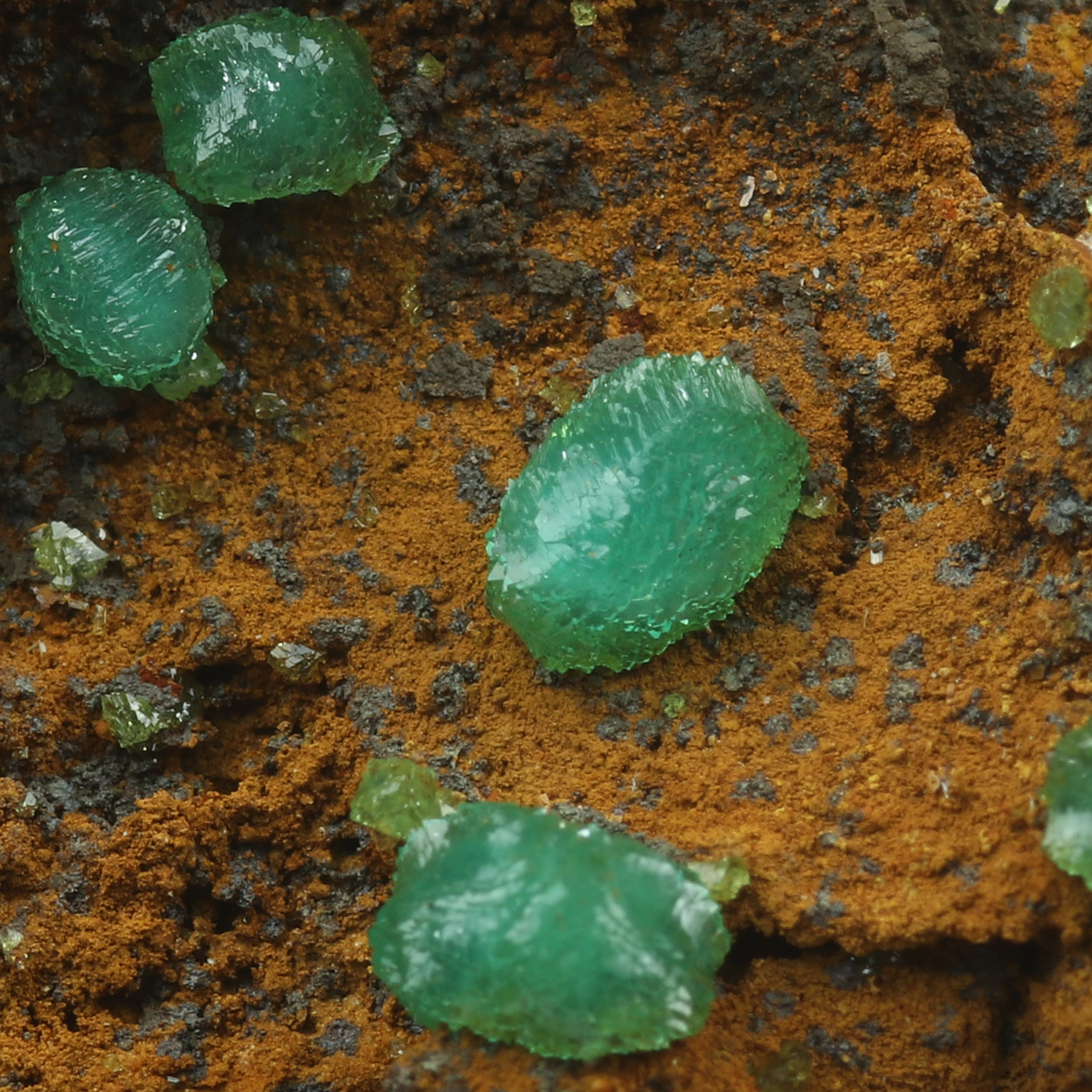 Gemmy, lustrous, green crystals of cuprian adamite on matrix. A classic Lavrion adamite specimen from a recent find.