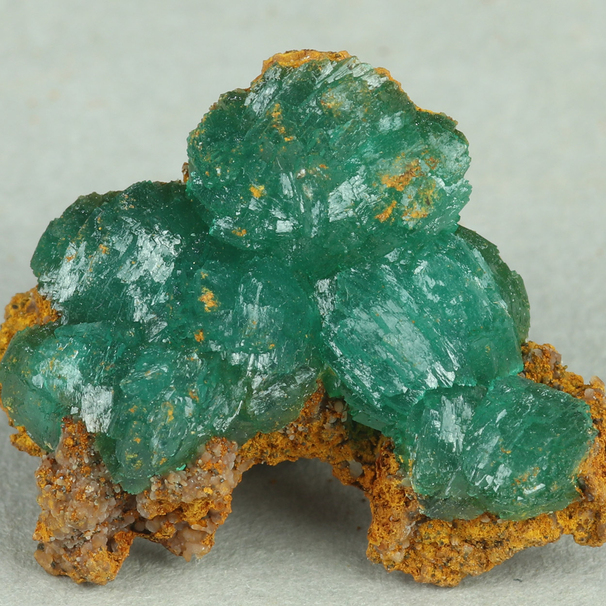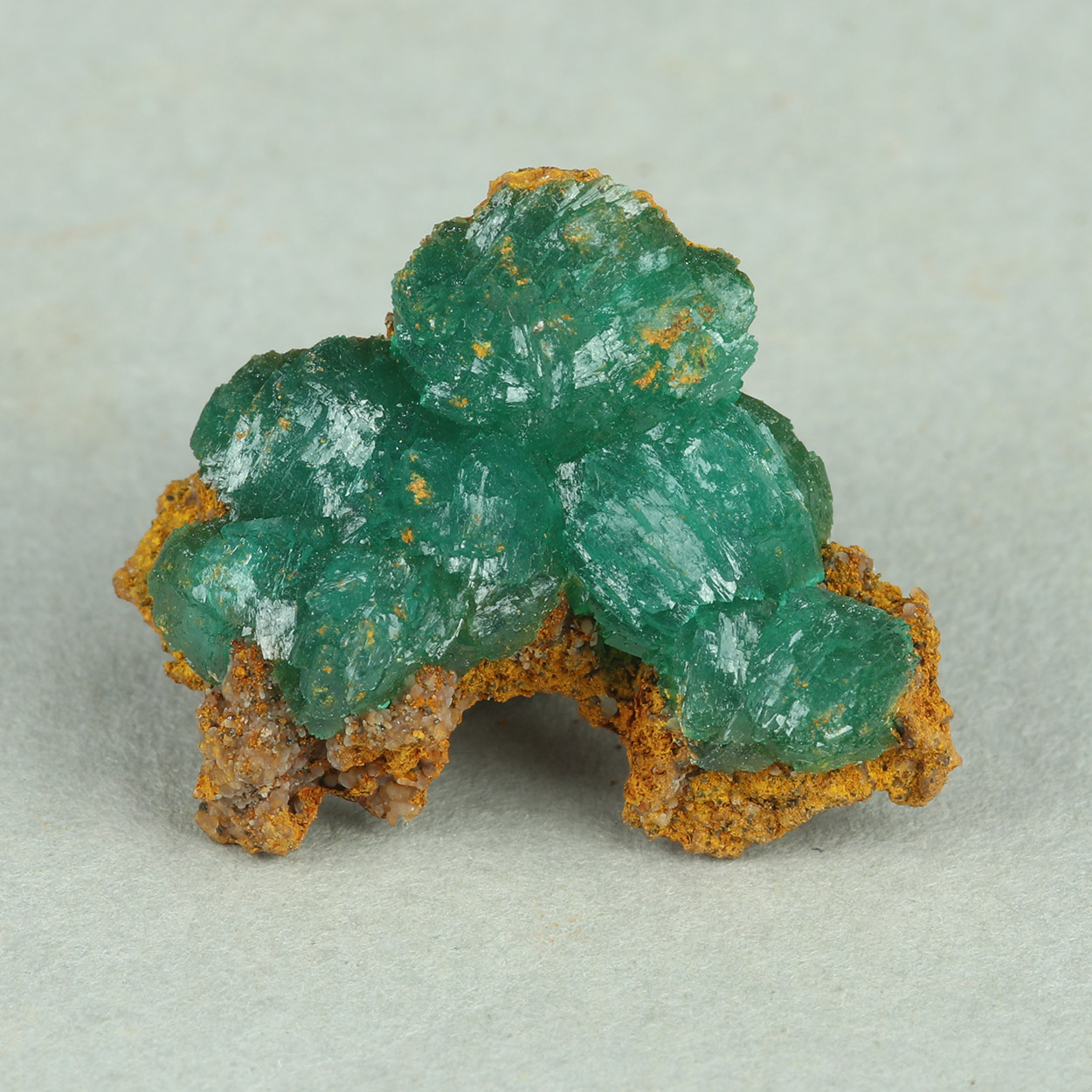 Top quality cuprian adamite from Lavrion with superb color, excellent luster and gemmy crystals on matrix.