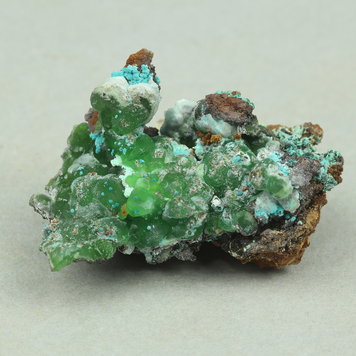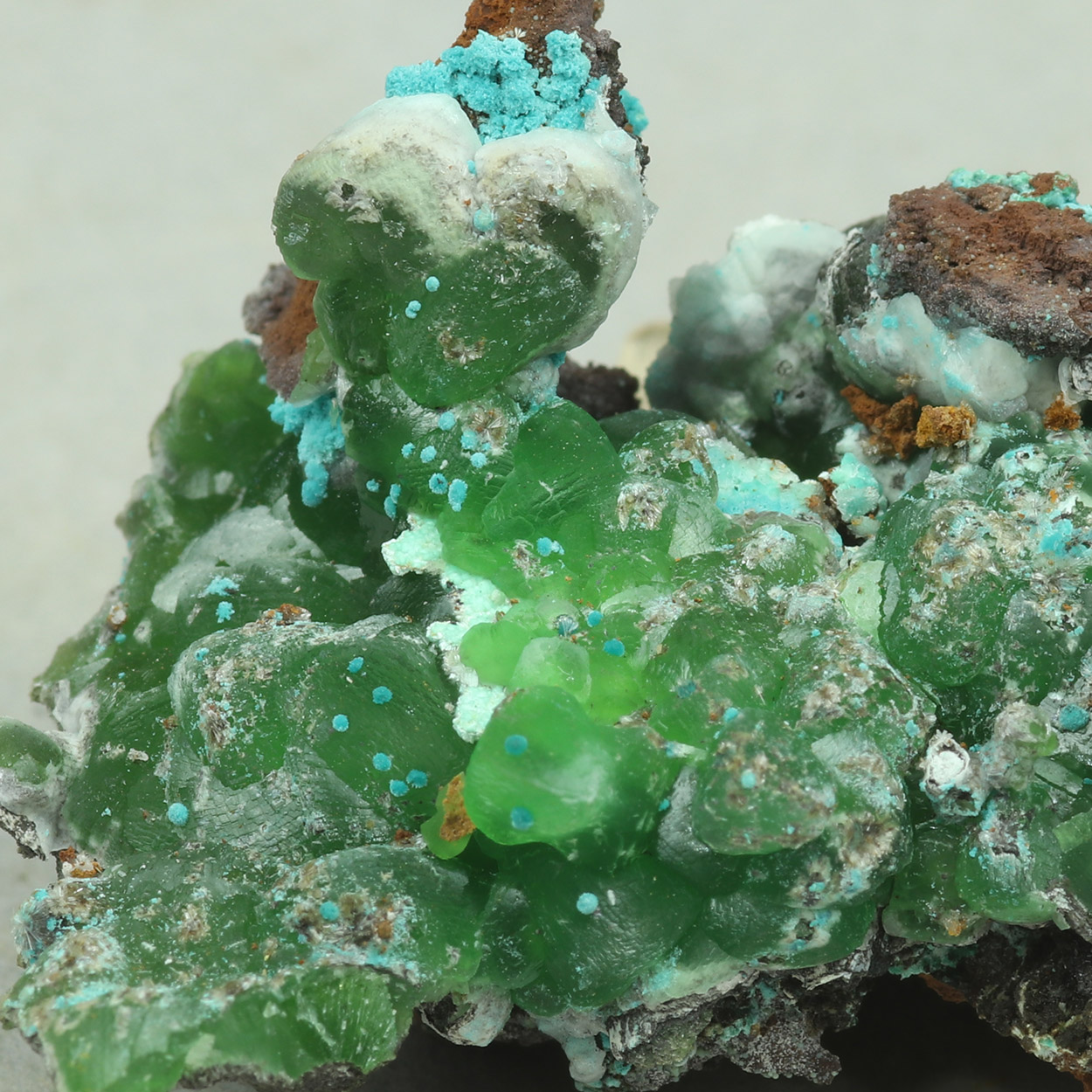 Gemmy and lustrous crystals of green, cuprian smithsonite on matrix. An excellent smithsonite specimen from Lavrion. Minor aurichalcite and hemimorphite are also present on the specimen.