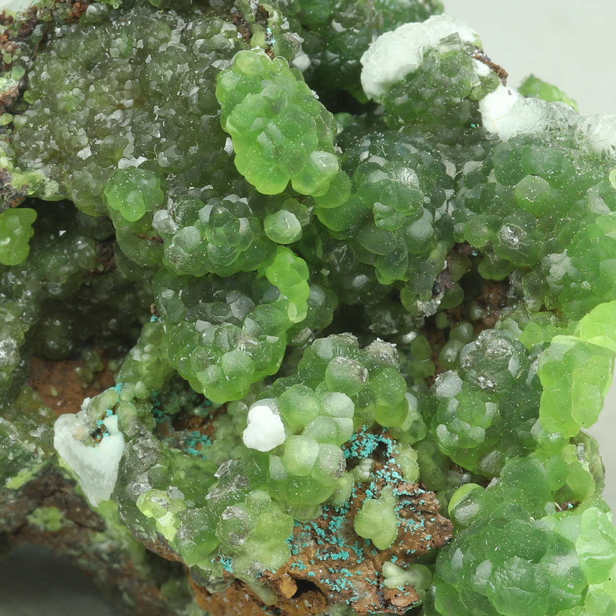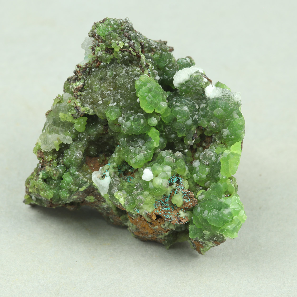 Gemmy and lustrous crystals of green, cuprian smithsonite on matrix. An excellent smithsonite specimen from Lavrion. Minor aurichalcite and hemimorphite are also present on the specimen.