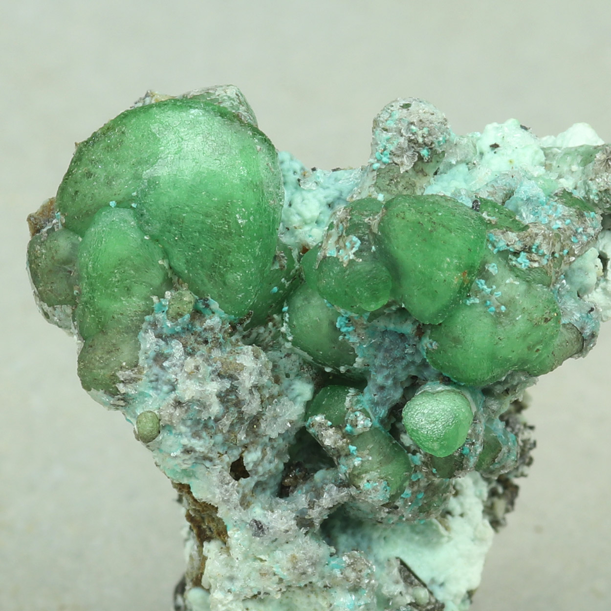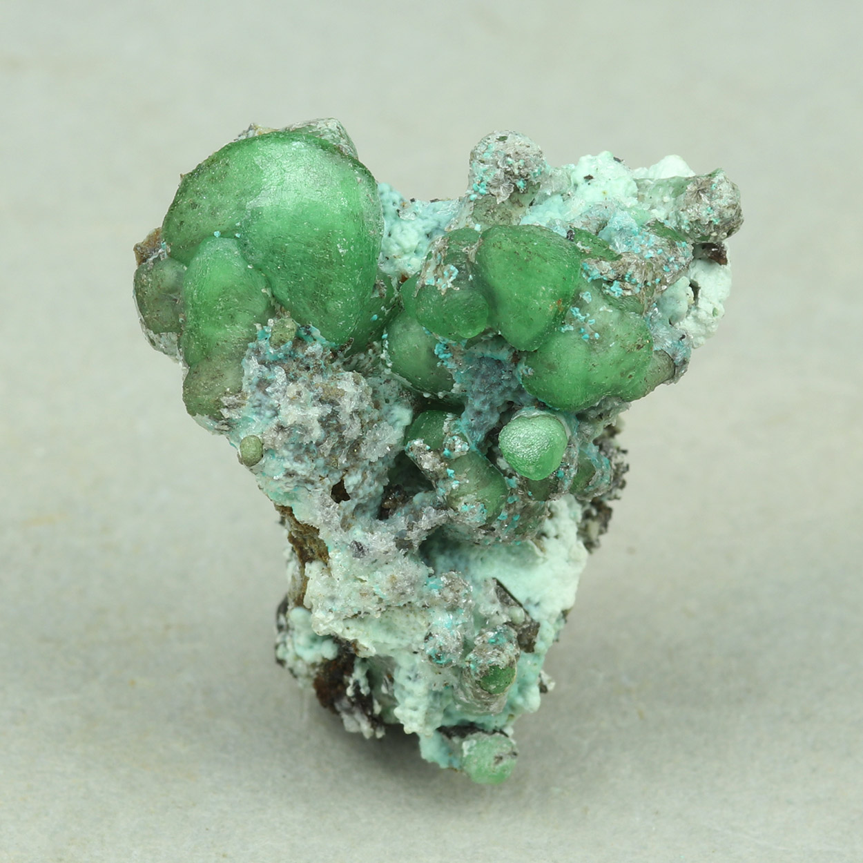 Gemmy and lustrous crystals of green, cuprian smithsonite on matrix. An excellent smithsonite specimen from Lavrion. Minor aurichalcite and hemimorphite are also present on the specimen.