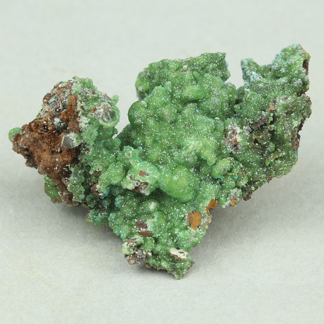 Sparkling crystals of green, cuprian smithsonite on matrix. An excellent smithsonite specimen from Lavrion. Minor aurichalcite and hemimorphite are also present on the specimen.