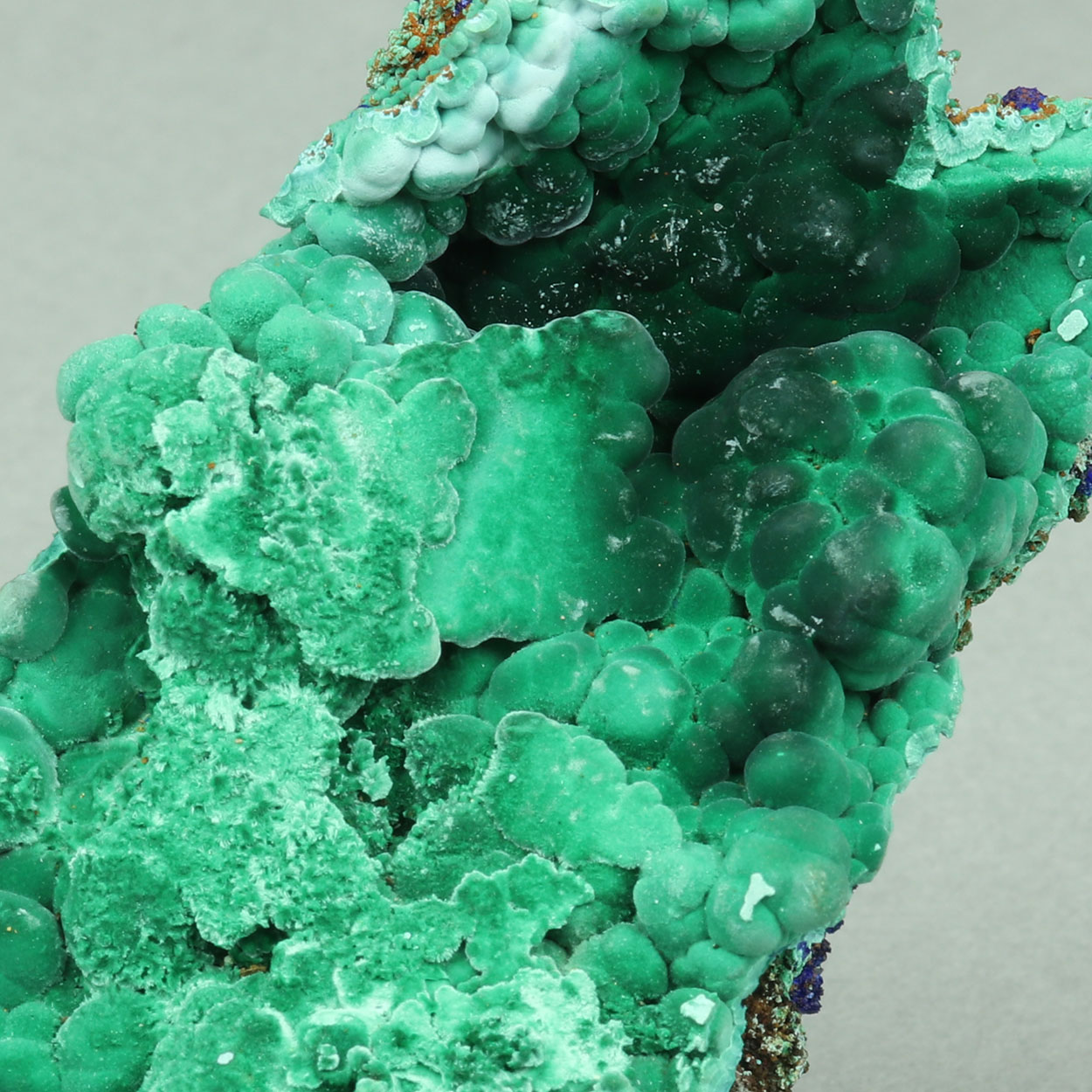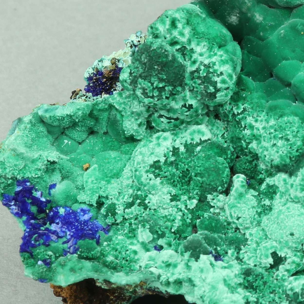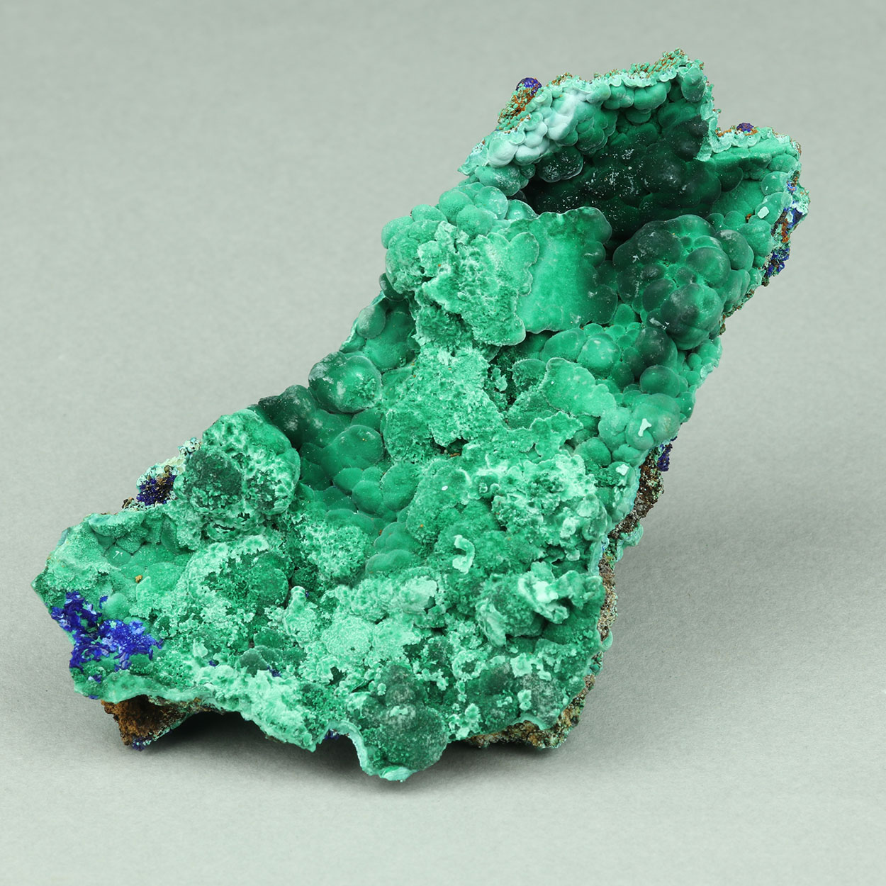 This is an excellent for Lavrion, rich malachite specimen with a little bit of crystallized azurite. As a bonus, there is a leaf-like formation of malachite after altered copper. Beautiful specimen from a find of May-June, 2025.