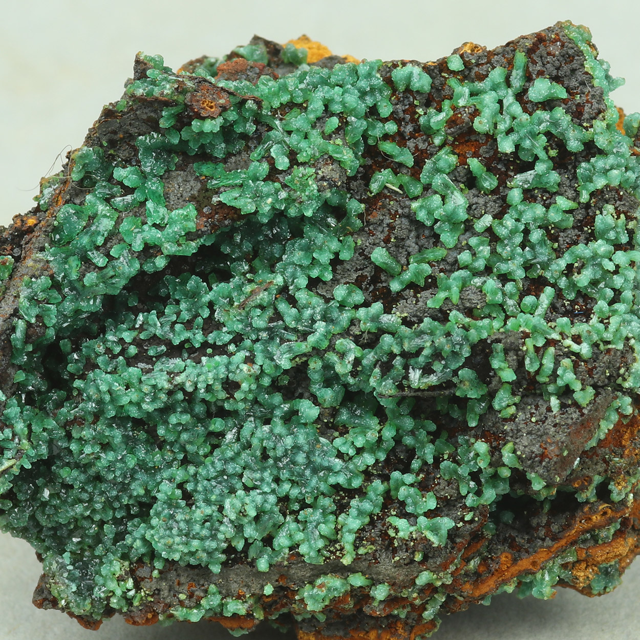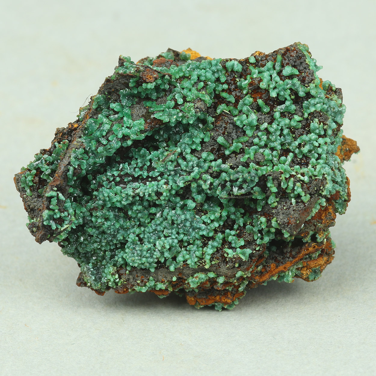 Here is a good example of Olivenite from Lavrion with green crystals on contrasting dark gossan matrix.