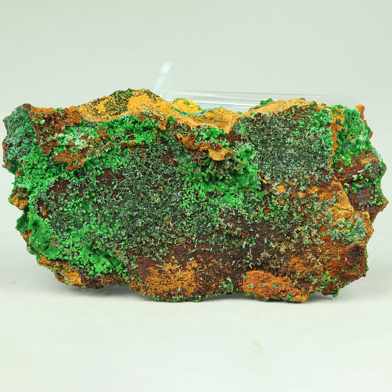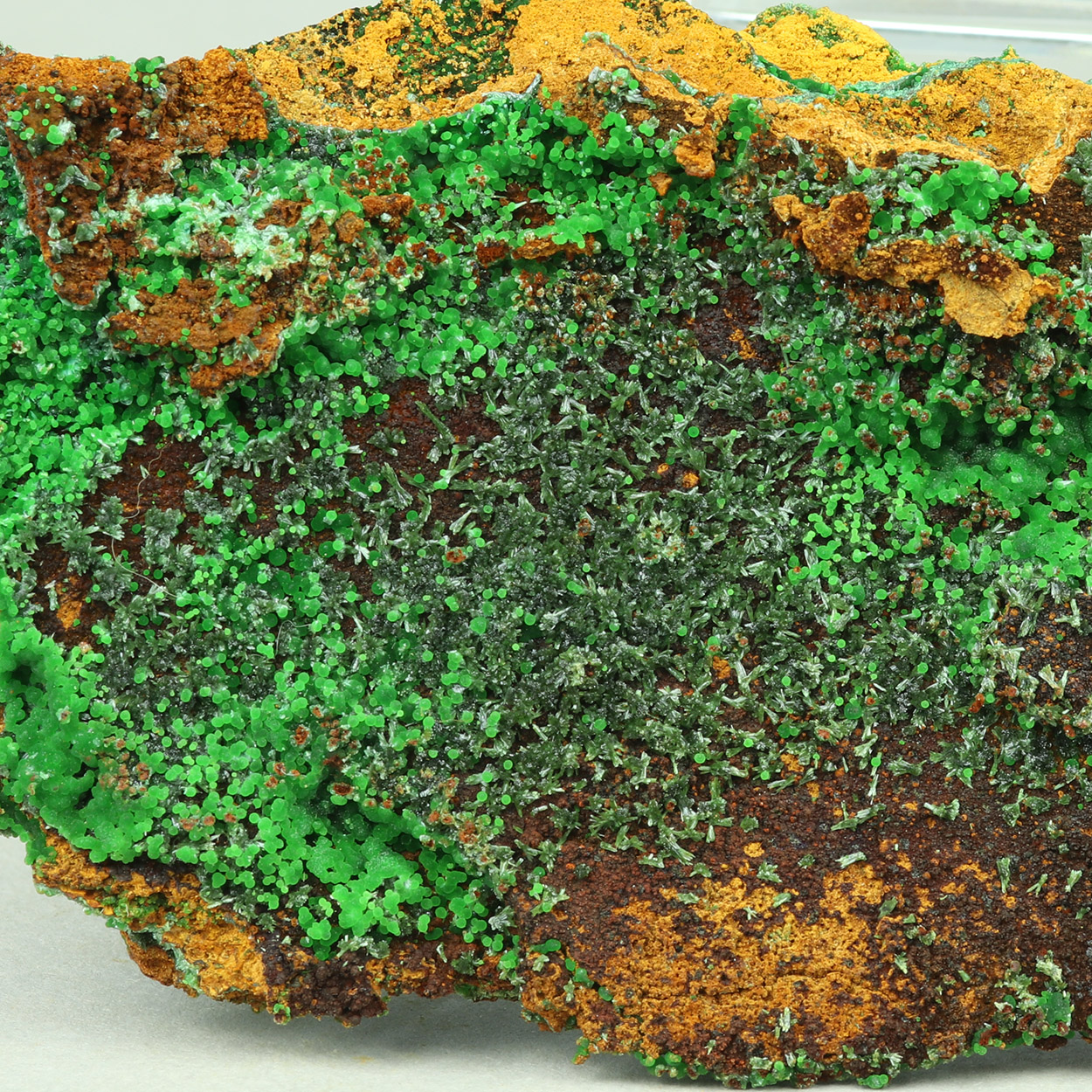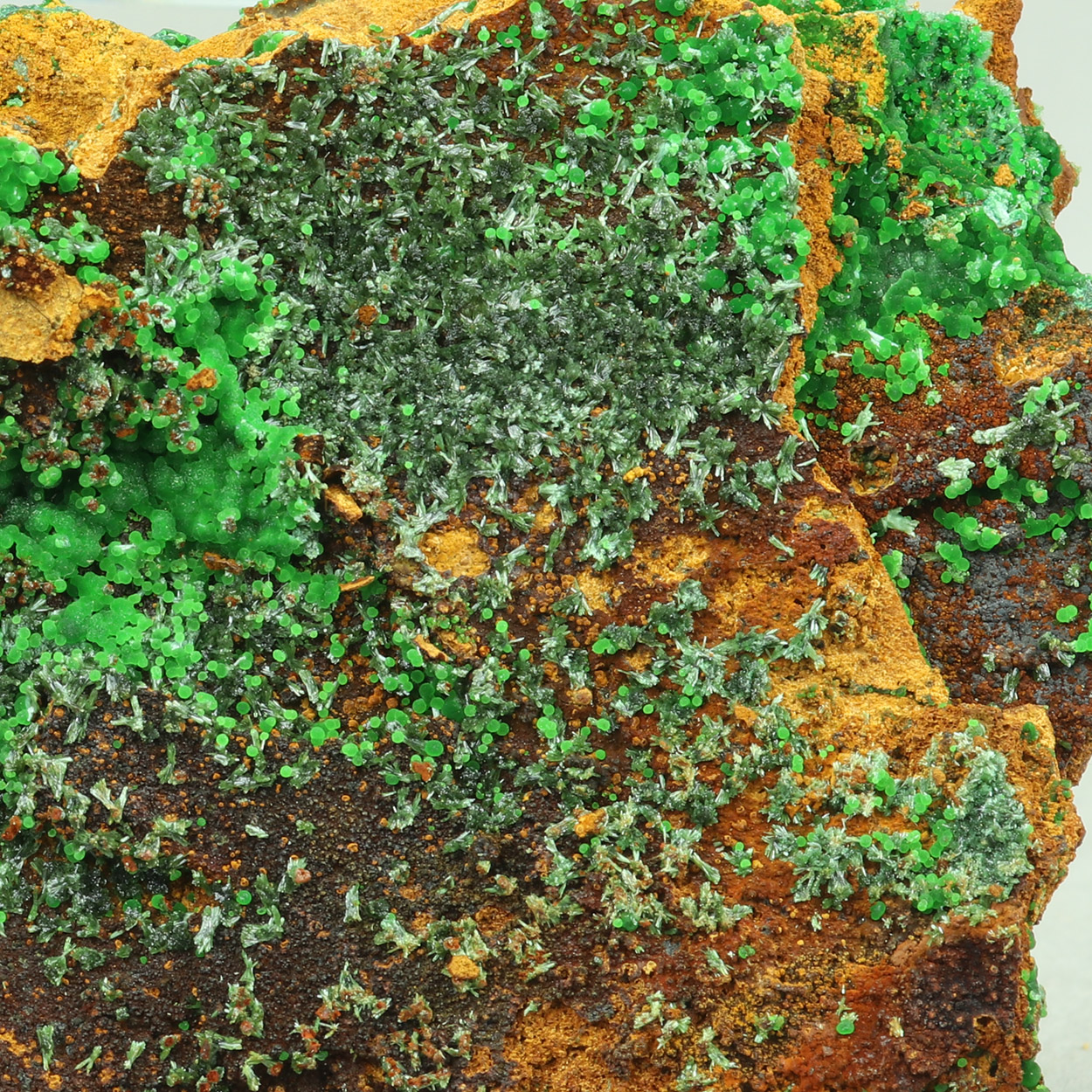 Large and rich specimen with green olivenite crystals and neon-green conichalcite spheres. Excellent combo from Lavrion.