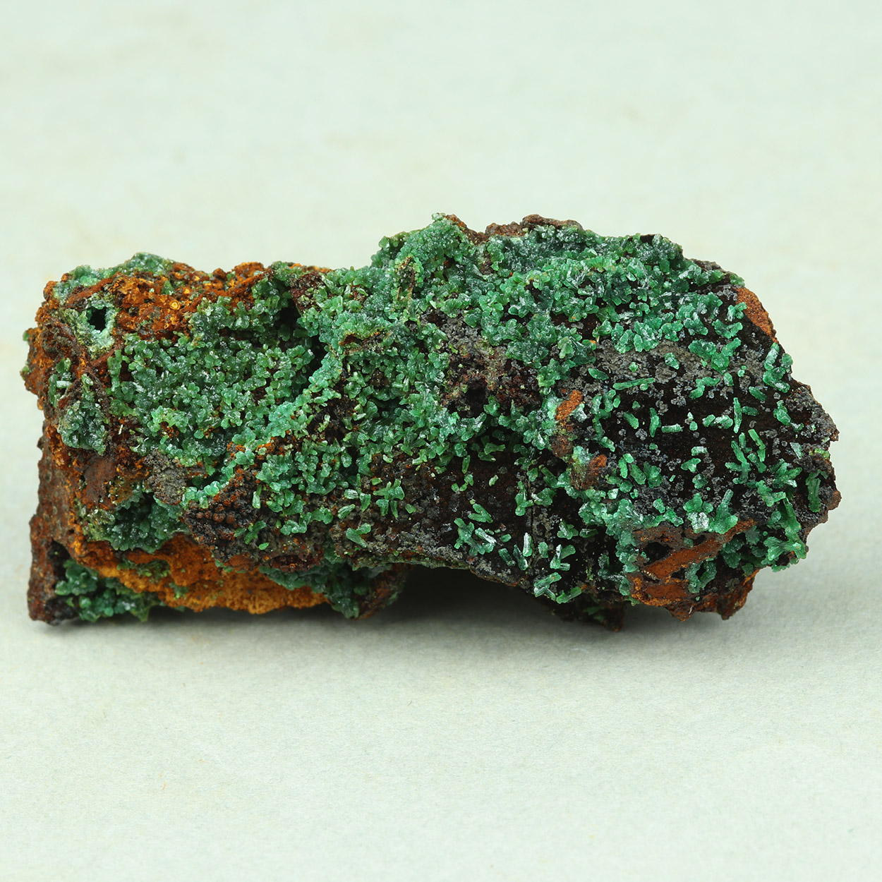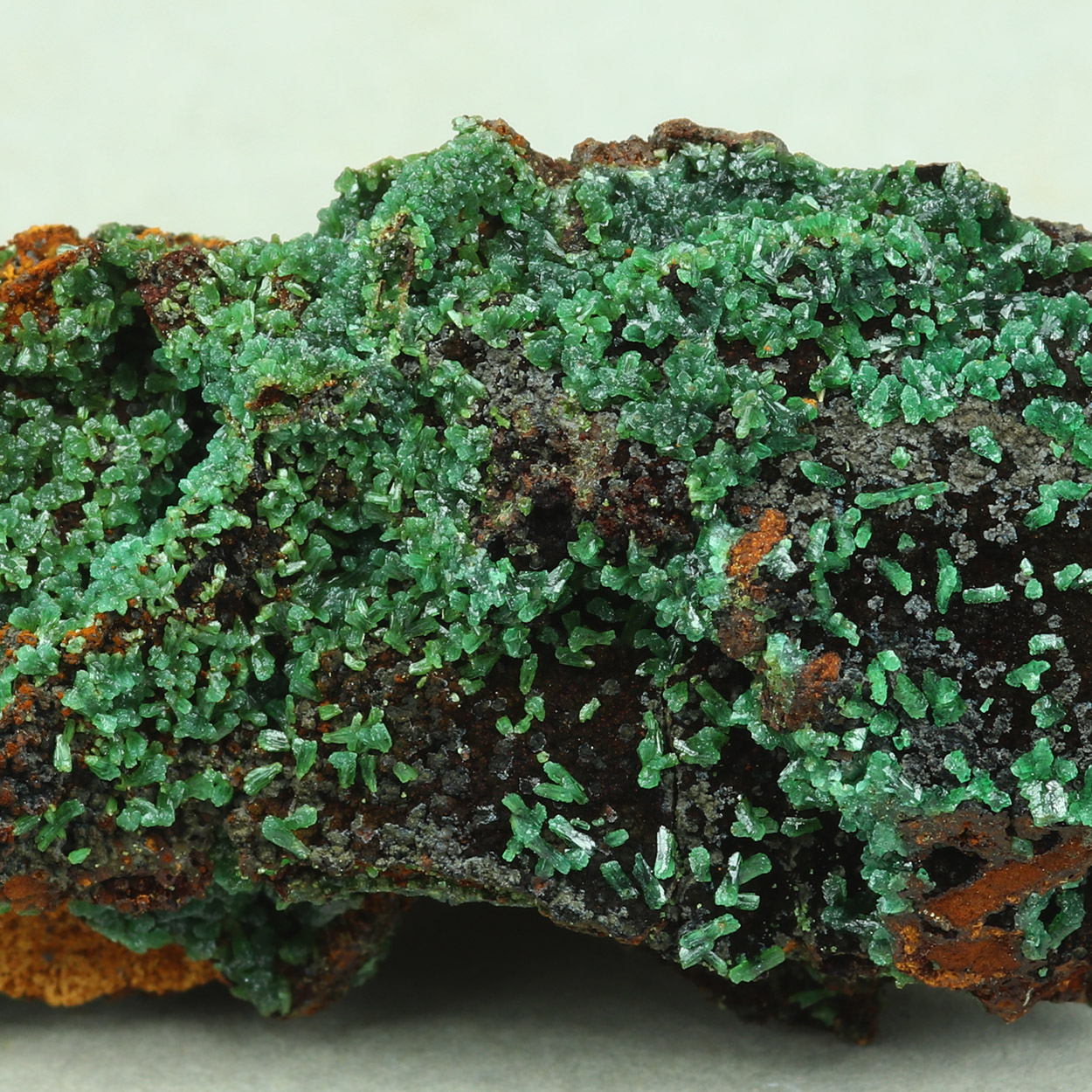 Here is a good example of Olivenite from Lavrion with green crystals on contrasting dark gossan matrix.