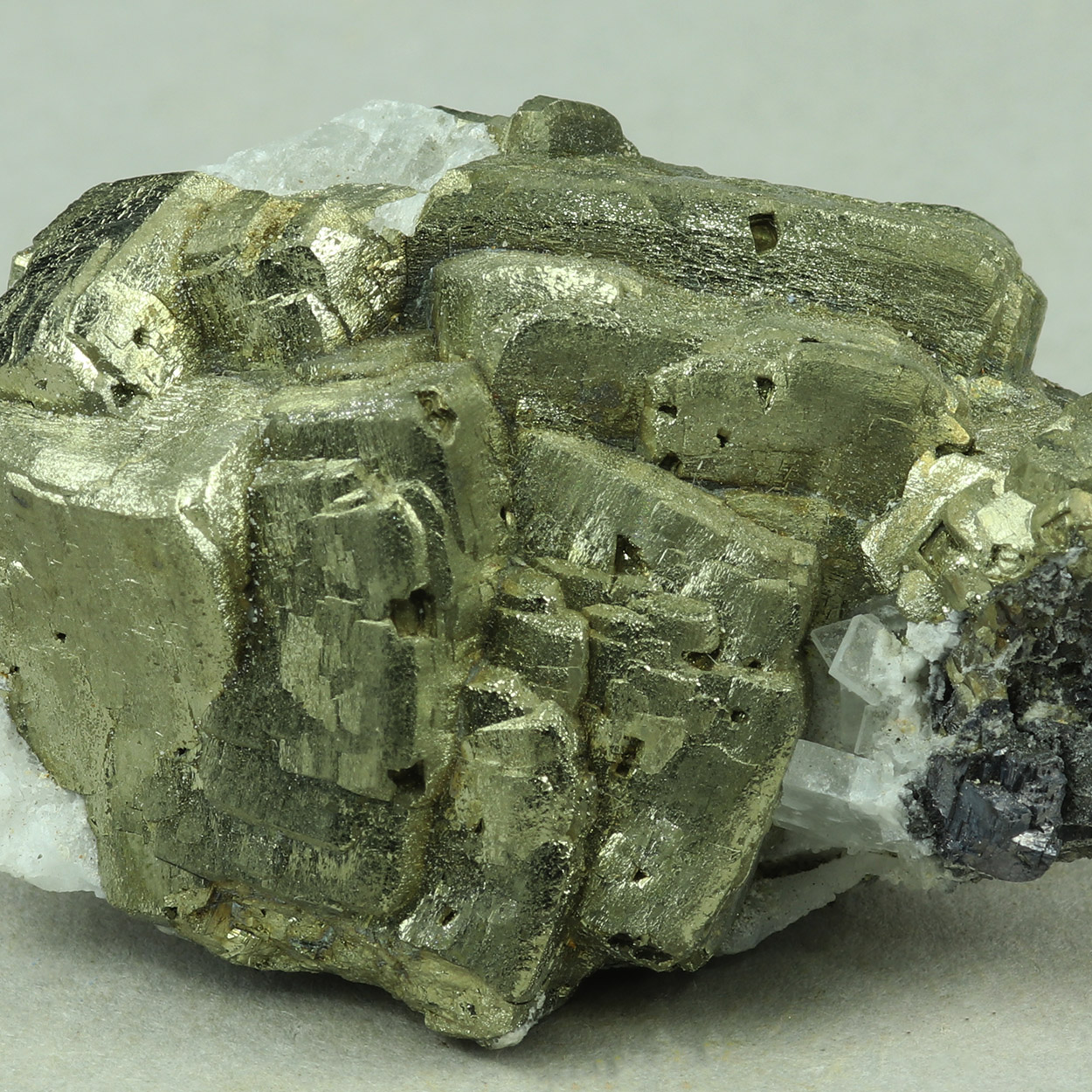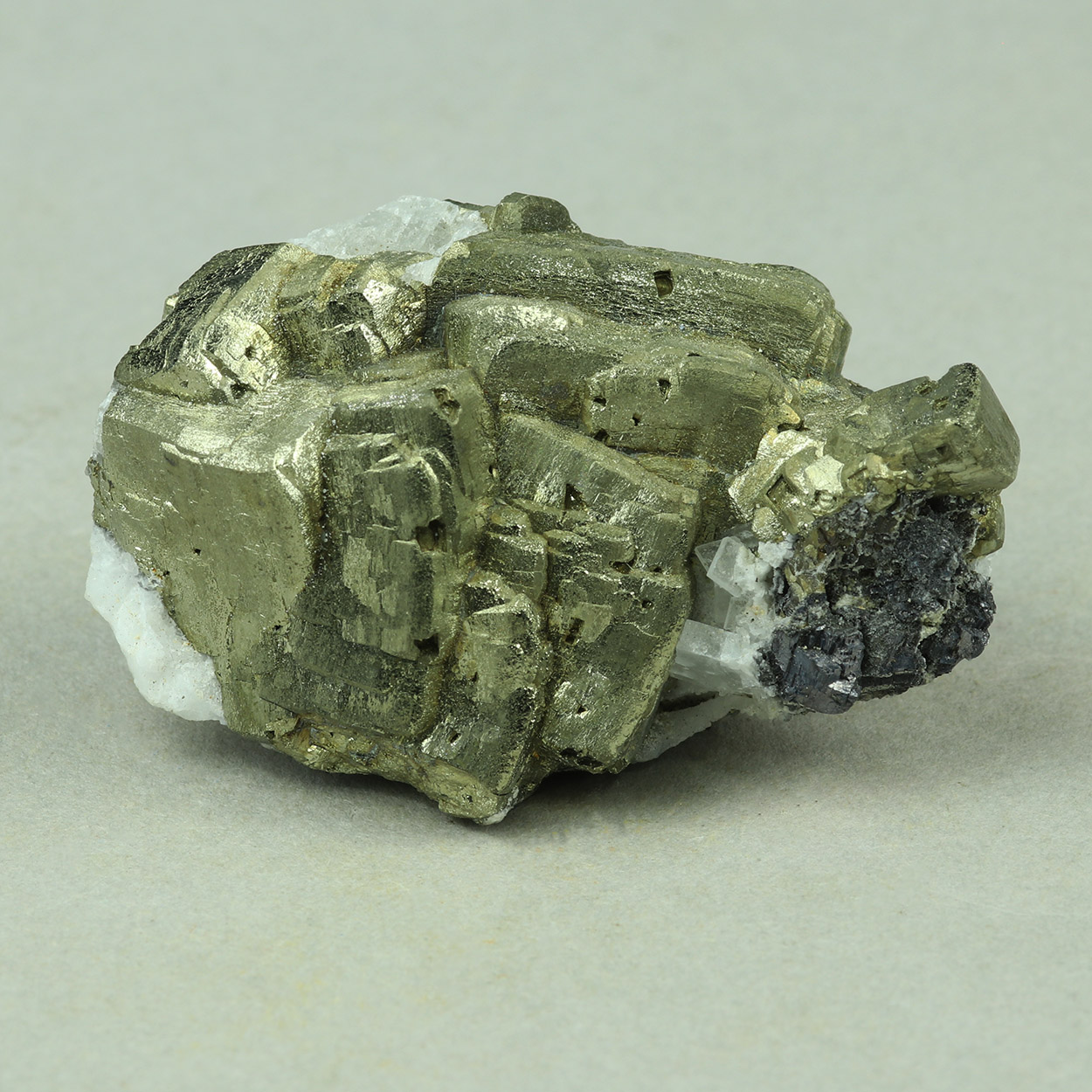 Lustrous golden pyrite crystals with interesting and unusual form/style/crystallization from the Androvo mine in Bulgaria. Associated with minor baryte & galena.