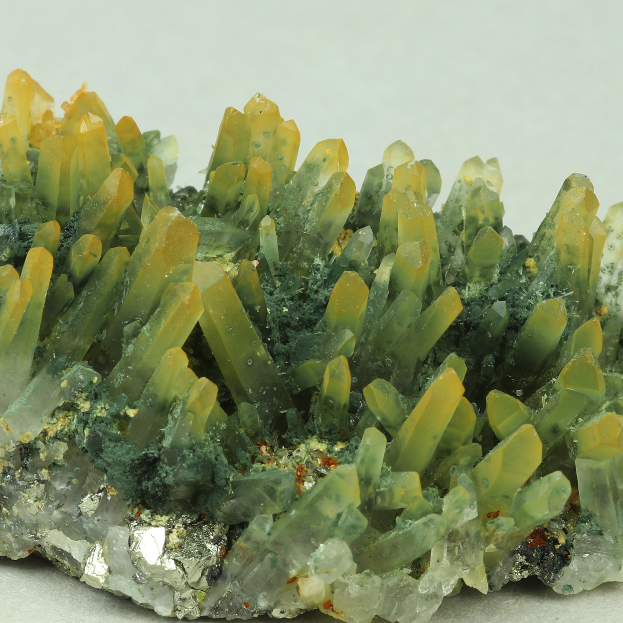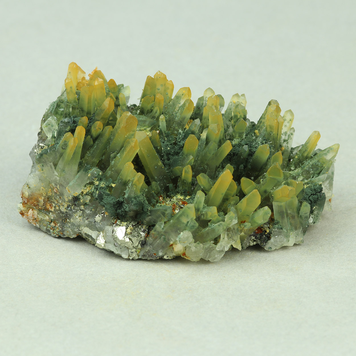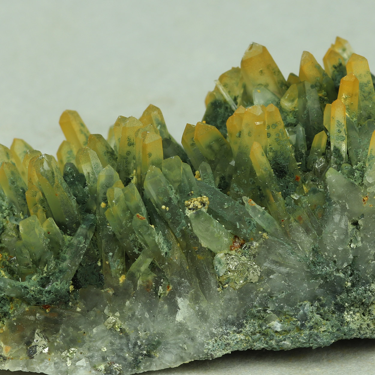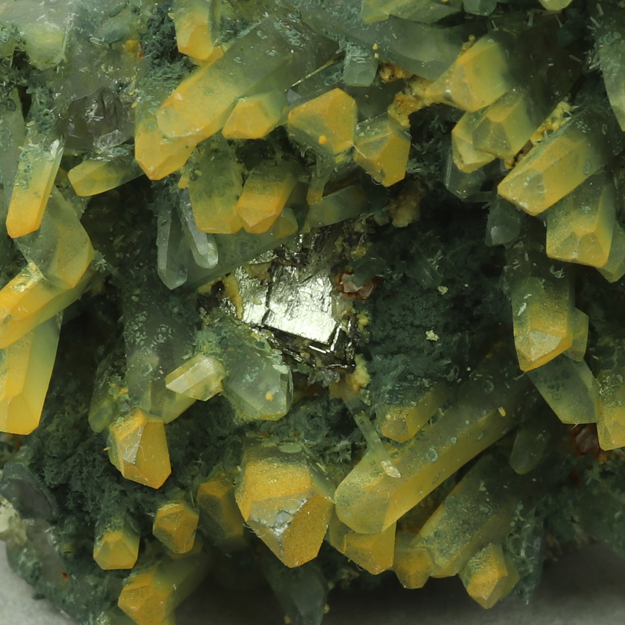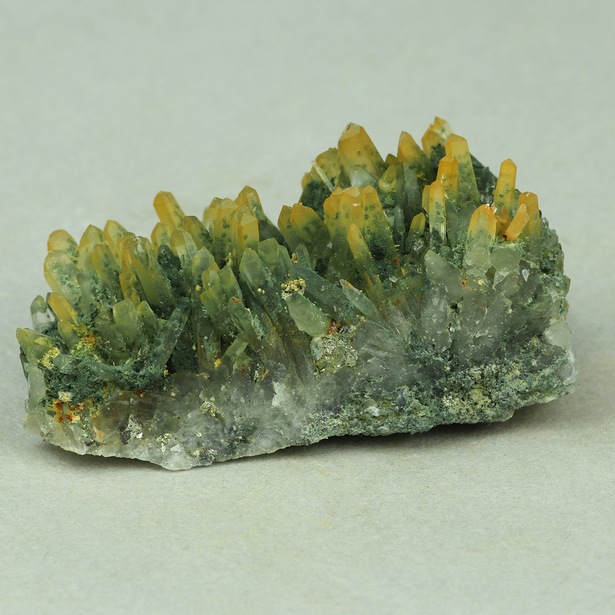 Interesting specimen with double colored quartz. The quartz crystals are chlorite included with the tips having a partial coating of yellow-orange oxides! As a bonus a pyrite cube is nestled inside the matrix.