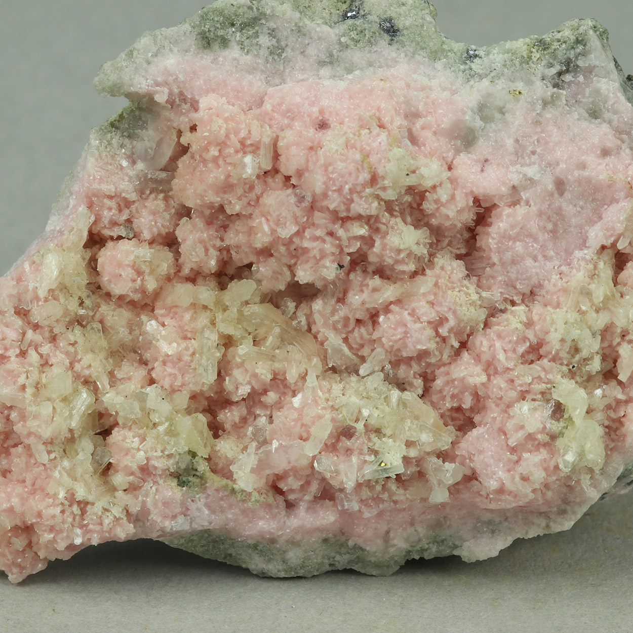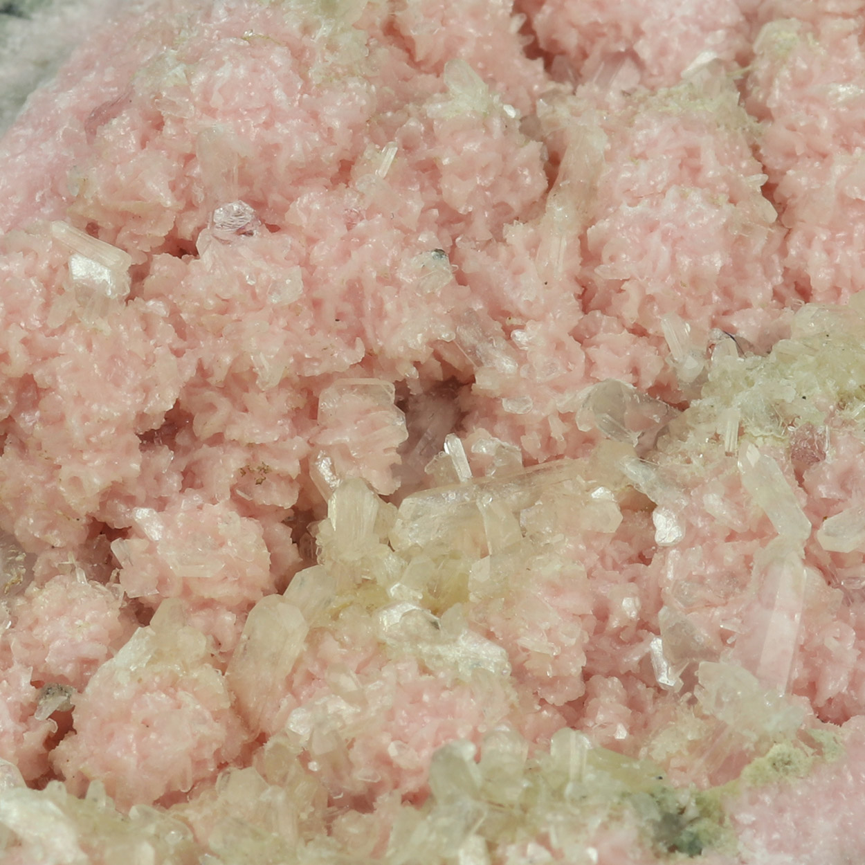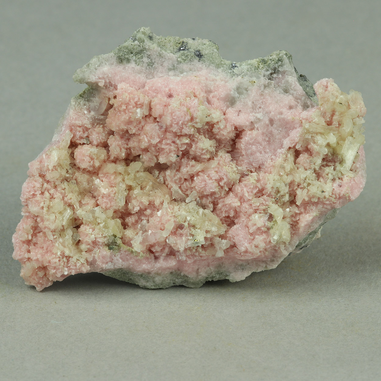 Beautiful combination of pink rhodochrosite crystals with little crystals of stilbite and minor quartz crystals. Nice specimen from Bulgaria.