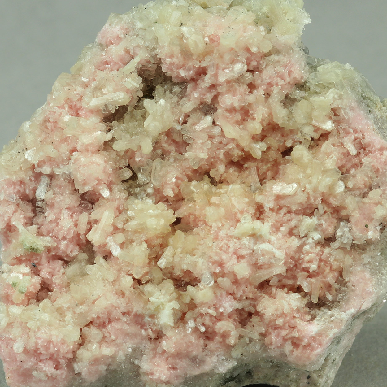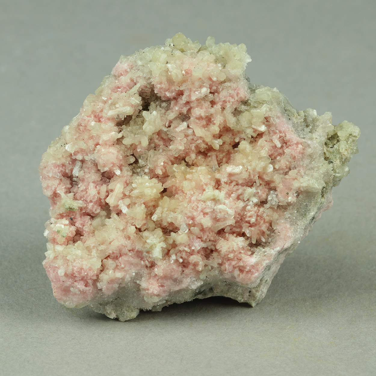 Beautiful combination of pink rhodochrosite crystals with little crystals of stilbite and minor quartz crystals. Nice specimen from Bulgaria.